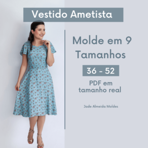 Neste arquivo você terá acesso ao molde do Vestido Azaleia, no tamanho 42, pronto para imprimir. Ele tem a saia midi com babado na barra, manga japonesa com barra godê e decote V. Este é um molde de nível fácil para quem tem experiência básica com costura. Pode ser feita em diferentes tecidos.