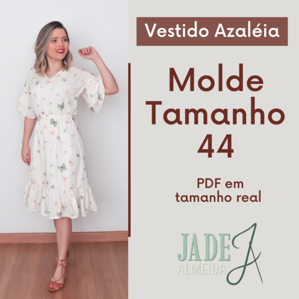 Neste arquivo você terá acesso ao molde do Vestido Azaleia, no tamanho 44, pronto para imprimir. Ele tem a saia midi com babado na barra, manga japonesa com barra godê e decote V. Este é um molde de nível fácil para quem tem experiência básica com costura. Pode ser feita em diferentes tecidos.